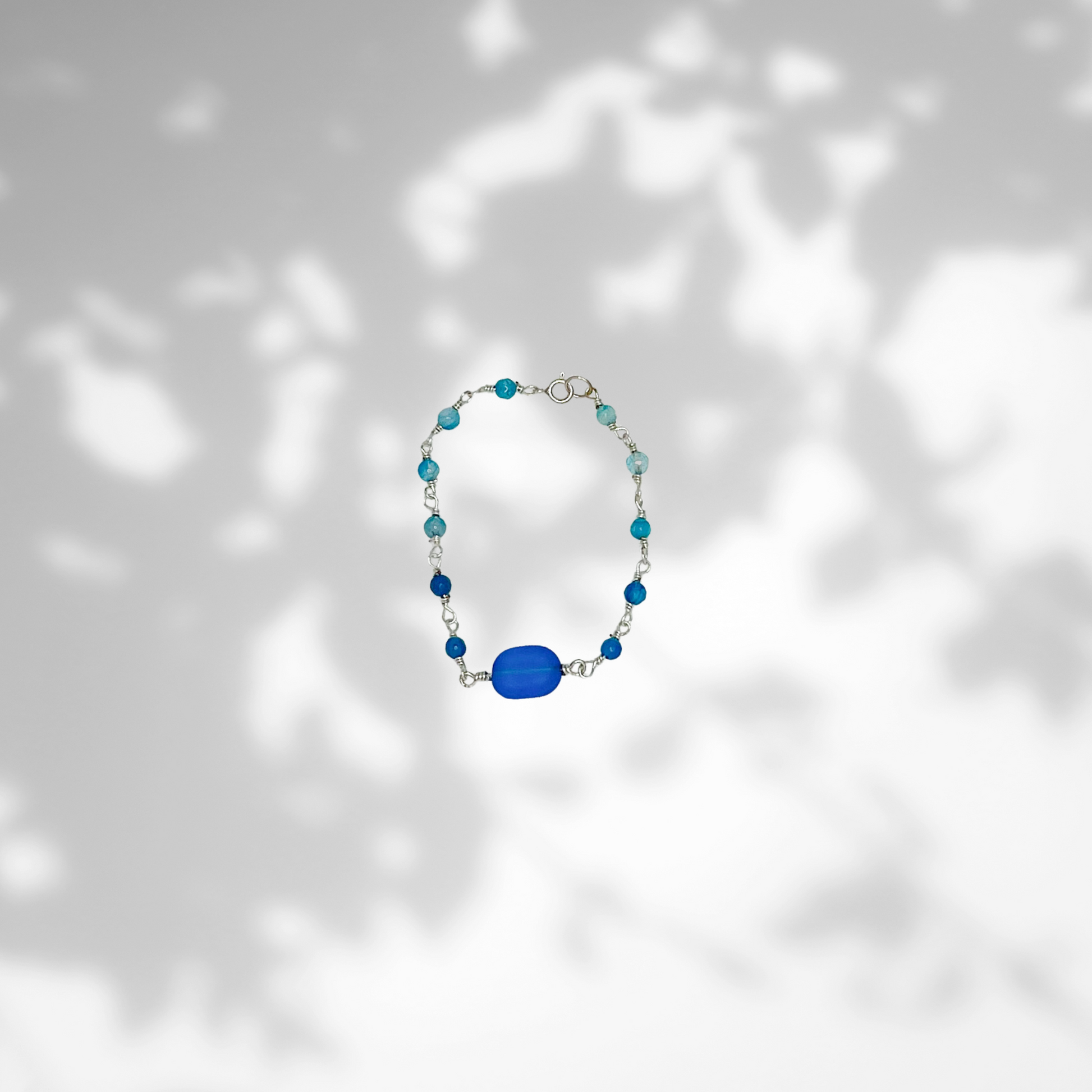 Elevate your wrist with our sterling silver bracelet, a captivating blend of gemstones and a single sea glass charm. This exquisite piece not only exudes the timeless elegance of sterling silver but also adds a touch of coastal beauty with the inclusion of a unique sea glass accent, creating a bracelet that beautifully merges sophistication and natural allure.